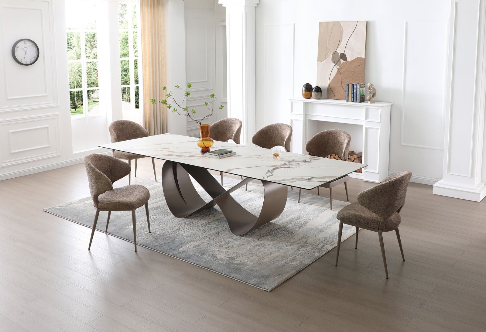 Stunning dining table adorned with a ceramic surface that perfectly emulates the elegant beauty of marble, bringing a touch of refined sophistication to your dining space.