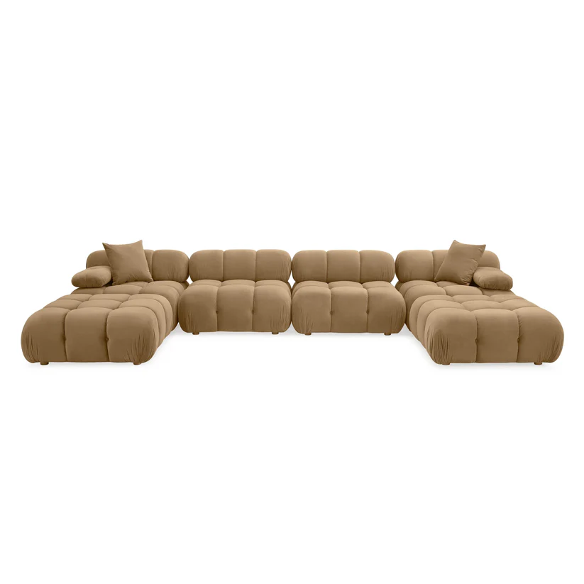 Introducing the Calliope Modular Collection, featuring ultra-soft upholstery that brings unmatched comfort. The deep hand-tufted structure creates the cushioning curves reminiscent of a brioche bun, enveloping you in a pillowy silhouette. With a modular layout allowing for endless configuration possibilities, the detached movable arm cushions add versatility, enabling you to customize your space easily. Available in cream or black vegan shearling and cafe au lait performance velvet options.