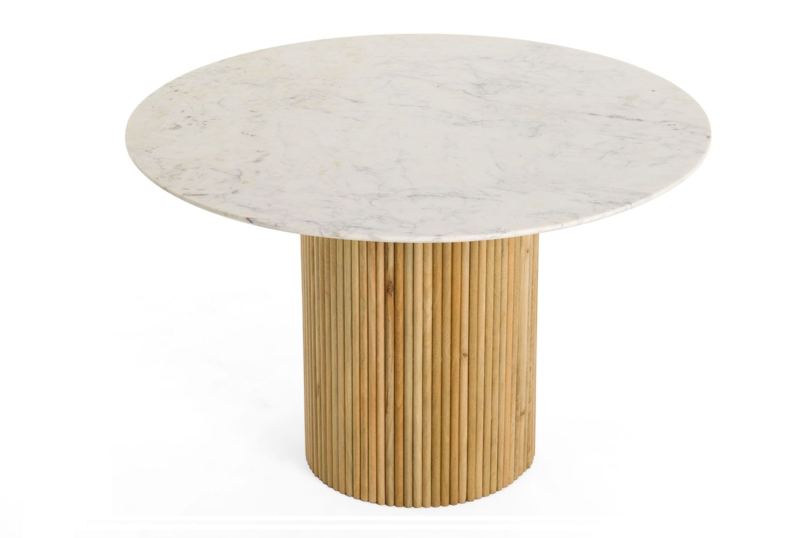 The Modrest Cambridge Round Dining Table adds a clean and dynamic vibe to your dining room with its washed mango wood pedestal base and visually appealing white marble top. This charming table seats 4 comfortably and pair with its matching buffets for a comprehensive dining area. Combine this dining table with other items from the same Cambridge collection.