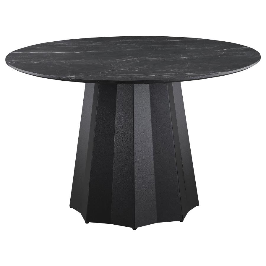 – Star-inspired pedestal is crafted in metal for a balanced look in the faux black marble dining table