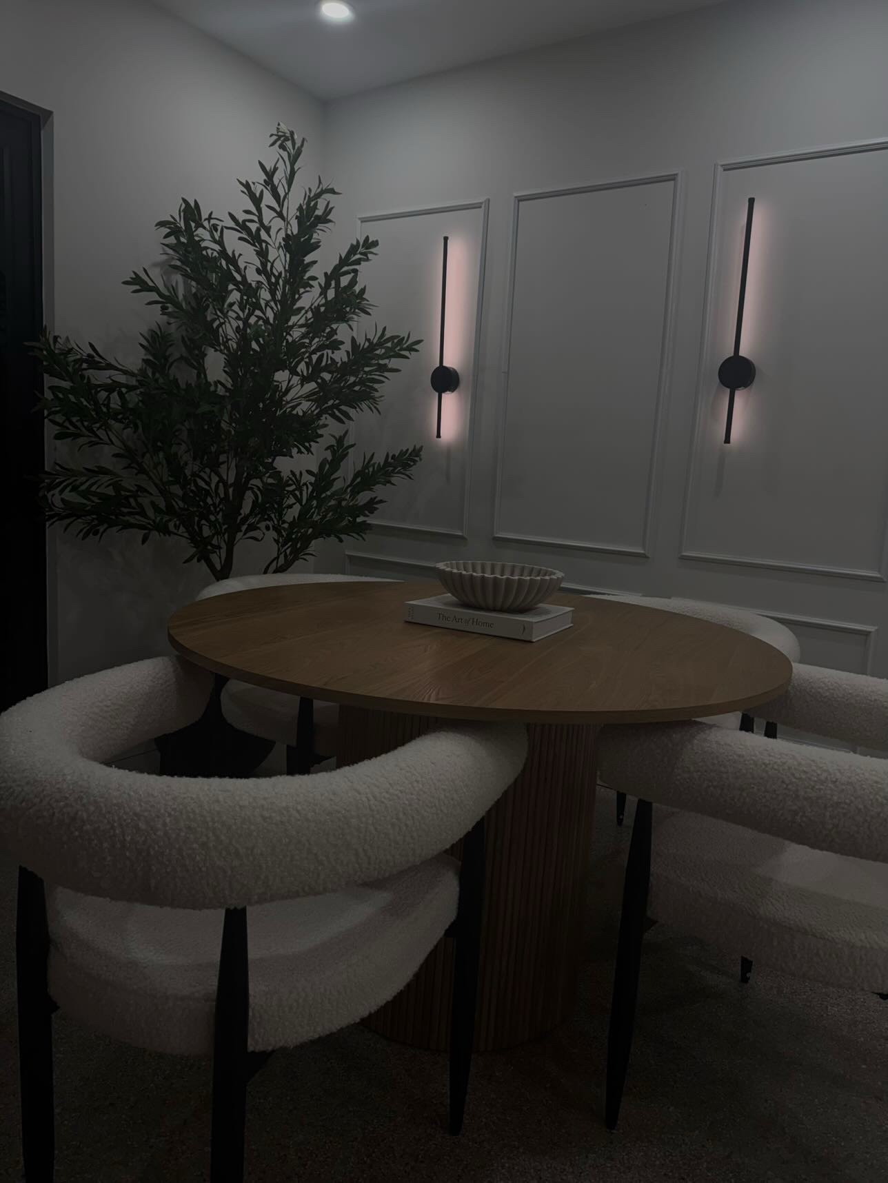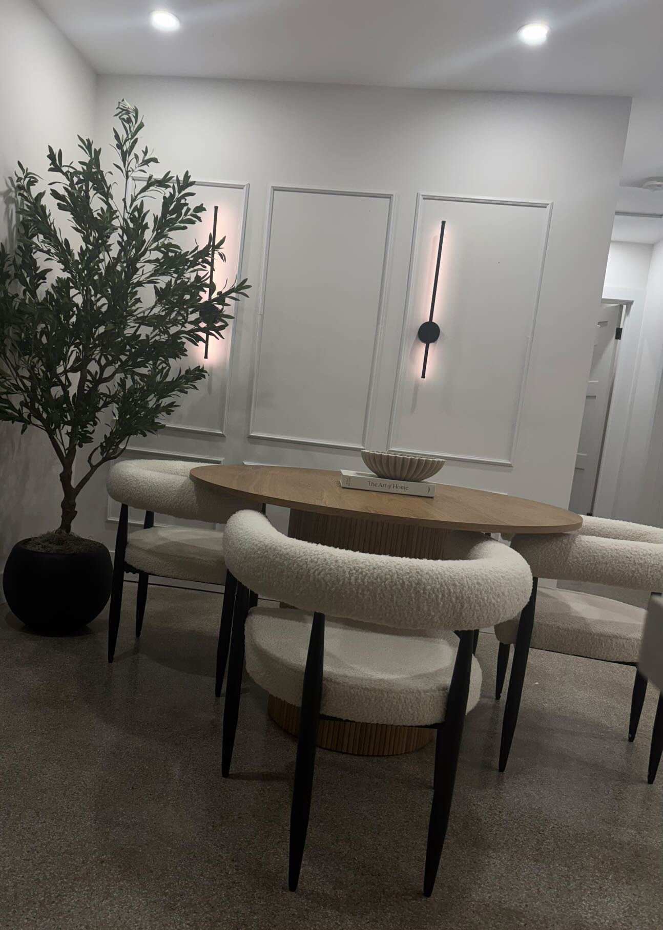 – Chairs feature slim, curved backs and plush cushioning in cream upholstery with impeccable texture
