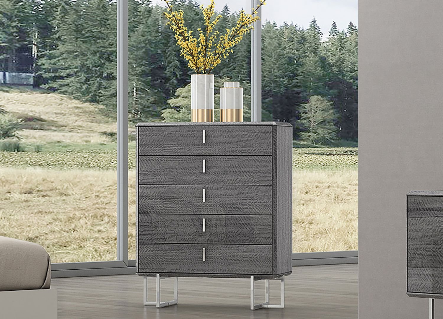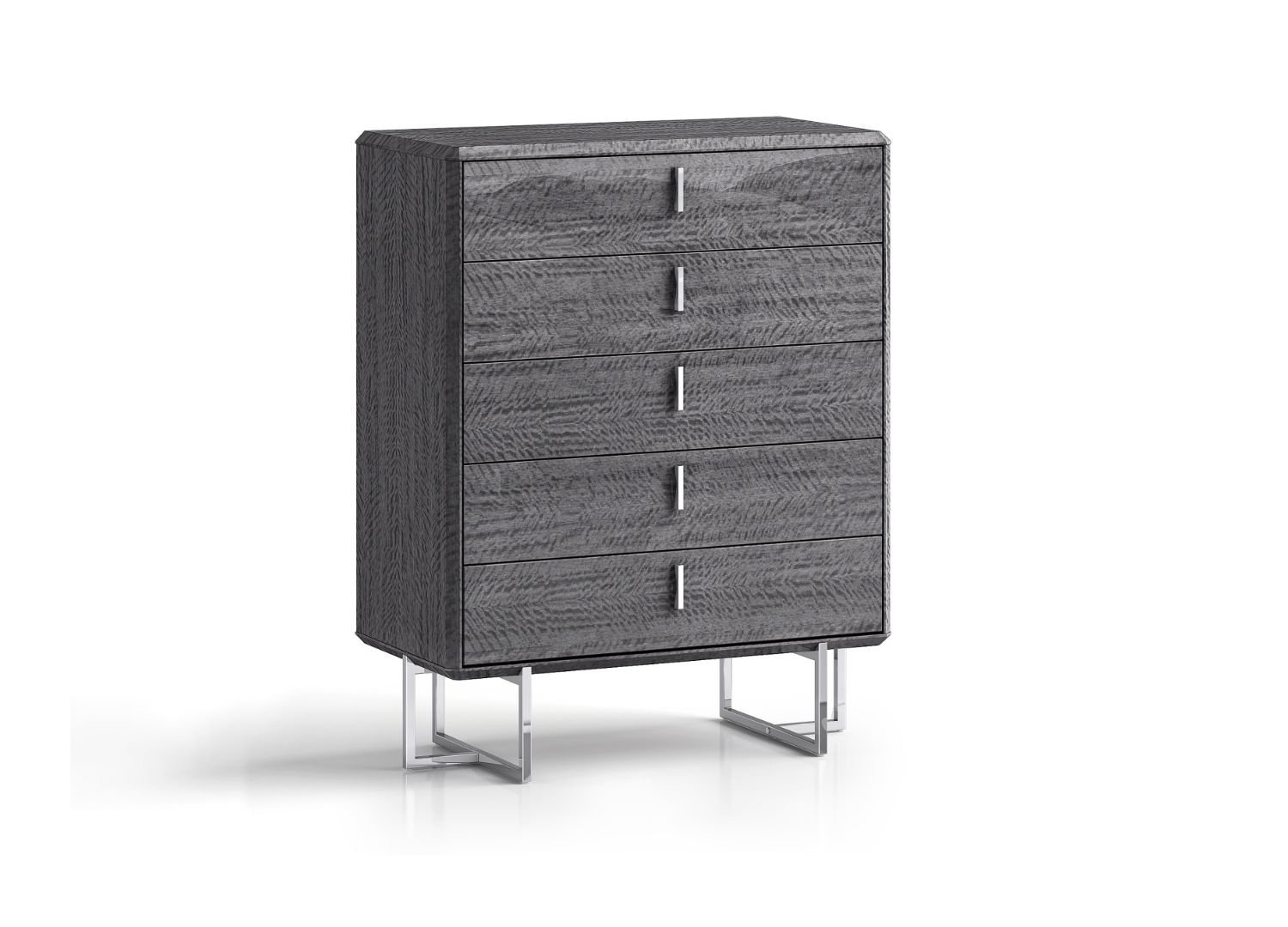 The Chloe chest of drawers is graced with elegant metal legs and topped with a glossy structure. This unexpected combination of materials lends exclusive style and appeal to this companion piece for the Chloe bedroom.