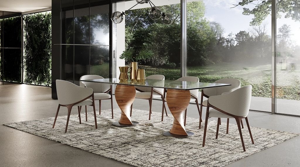 Statement Contemporary Dining Table with twisted solid wood double pedestal base in Walnut finish and temprered Glass table top.