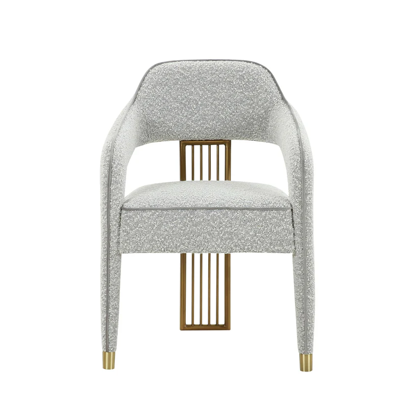 The Corralis chair is here to make a luxe statement with its elegant silhouette and art deco design. This stunning chair features a sturdy wooden frame upholstered in a textural boucle fabric, supported and accented by a gold stainless steel base. This is the perfect piece to glam up your dining experience!
