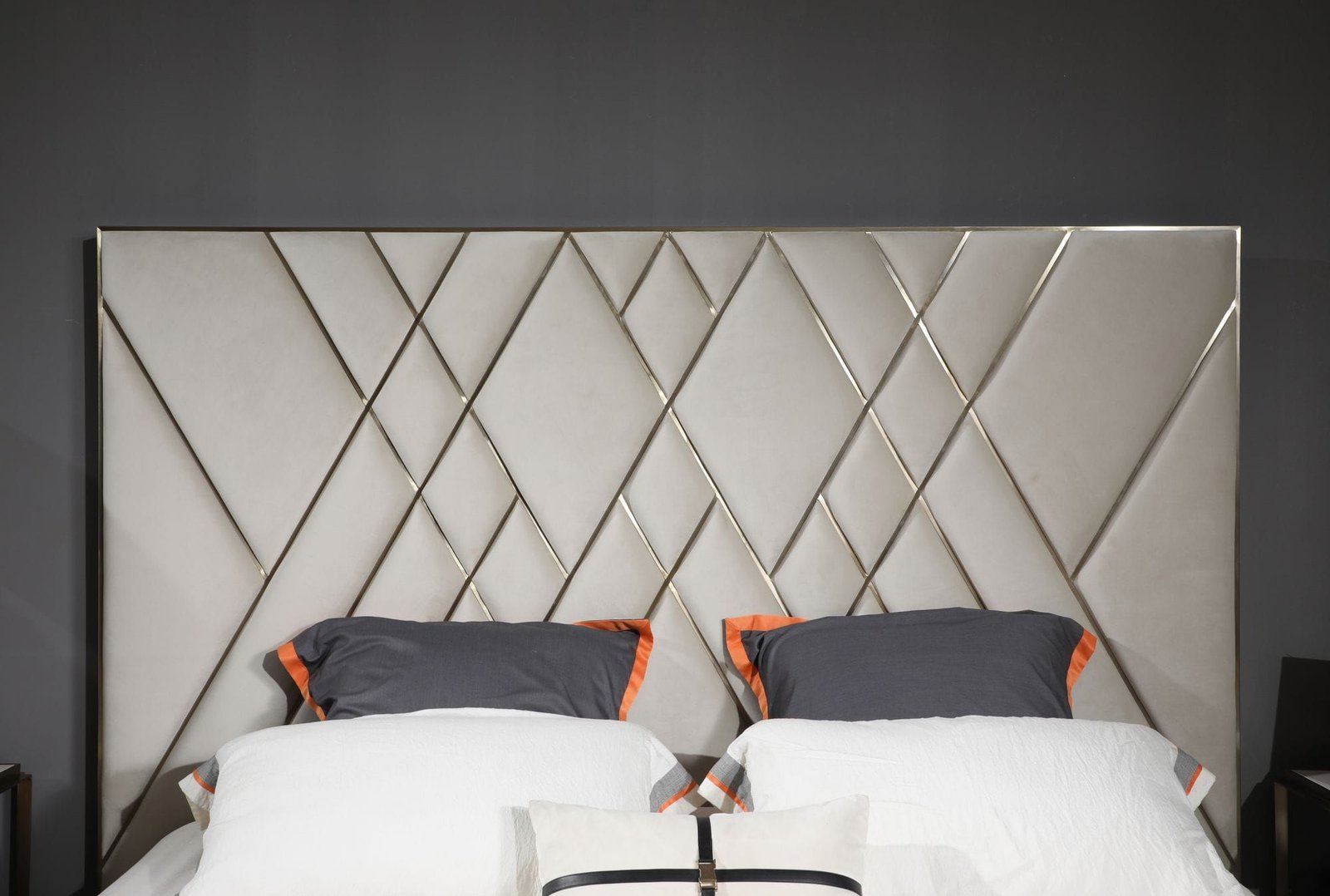 The Eldora Bed is a stylish modern bed with glam materials that brightens up any space. A beautiful beige velvet fully upholsters the frame of this tall bed. Brushed brass inserts create a geometric pattern that adds visual interest. Brushed brass is also accented on the low profile legs. Perfect for a contemporary bedroom.