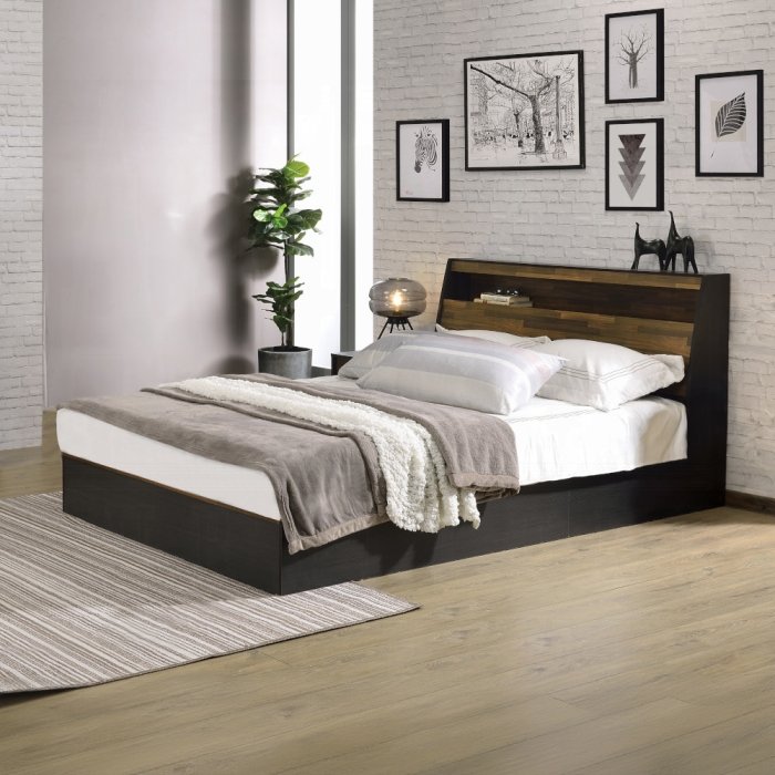 The focal point of any bedroom is a comfortable bed that invites you to unwind at the end of the day. The walnut & black finish create a perfect modern contrast and color scheme. The bed boasts a storage headboard with an open compartment for displaying decorative pieces. Adding more function to the bed, it offers a hidden storage base. Complete the look with the matching case goods that will help you stay organized
