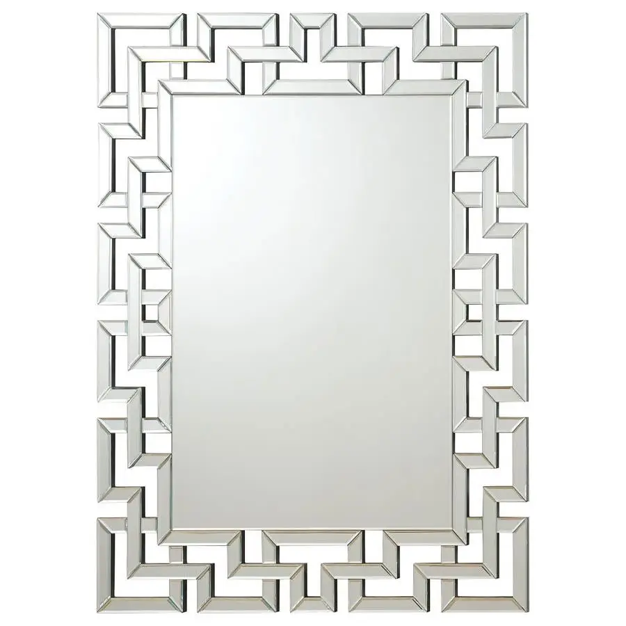 | – Wall mirror with rectangular shape and mirrored glass surface for full reflection – Framed in beveled mirrored panels with a layered geometric interlock pattern – Can be mounted vertically or horizontally for versatile wall placement – Reflective frame adds depth and amplifies light in any room – Distinctive design creates a bold focal point in modern interiors – Ideal for entryways, bedrooms, or living spaces seeking a statement mirror |