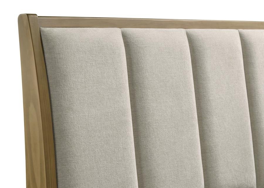 | Create a cohesive and inviting space with this four-piece bedroom set, blending transitional style with modern highlights. The set includes a bed, nightstand, dresser, and mirror, each finished in natural pine, exuding warmth and sophistication. The bed features a vertical channeled upholstered headboard, adding a touch of luxury to your sleep space. Each piece is designed with softly curved fronts, square tapered legs, and antique nickel hardware, enhancing the set’s overall elegance. This bedroom set is perfect for those seeking a balanced mix of classic and contemporary design. |