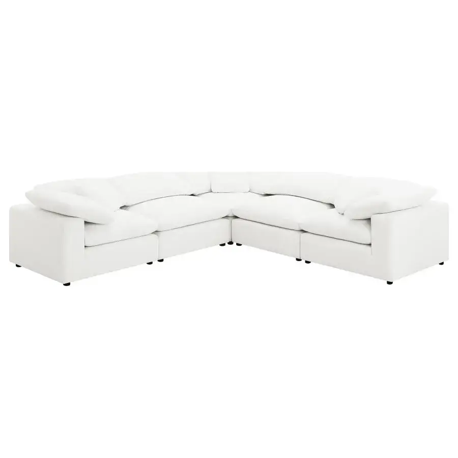 Center your relaxed living space on a modern five-piece sectional sofa, taking a laid-back approach to seating. This sofa, upholstered in tailored water-resistant boucle performance fabric with topstitch details, offers a refined, contemporary style in a neutral hue, perfect for any inviting living room. Customize your seating space with modular options, allowing you to create the perfect lounging environment. The plush, feather blend filled cushions will leave you motionless in ultimate comfort, as if wrapped in airy, cloud-like seating. Wide track arms add structure to the low slung silhouette, while an included ottoman encourages relaxation and round legs provide excellent support, complete with plastic glides to protect your flooring