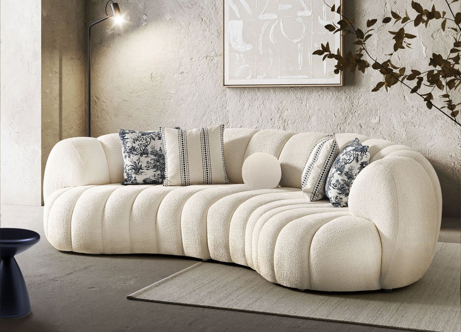 Graceful and inviting, this stunning Rhodes curved sofa flows like a gentle wave, bringing a sense of harmony and elegance to any space. Its plush, tufted design offers deep comfort, wrapping you in a warm embrace. Perfect for intimate conversations or moments of pure relaxation, this sofa transforms your living area into a sanctuary of style and serenity. A true statement piece, it blends luxury with comfort, making every gathering feel effortlessly special.