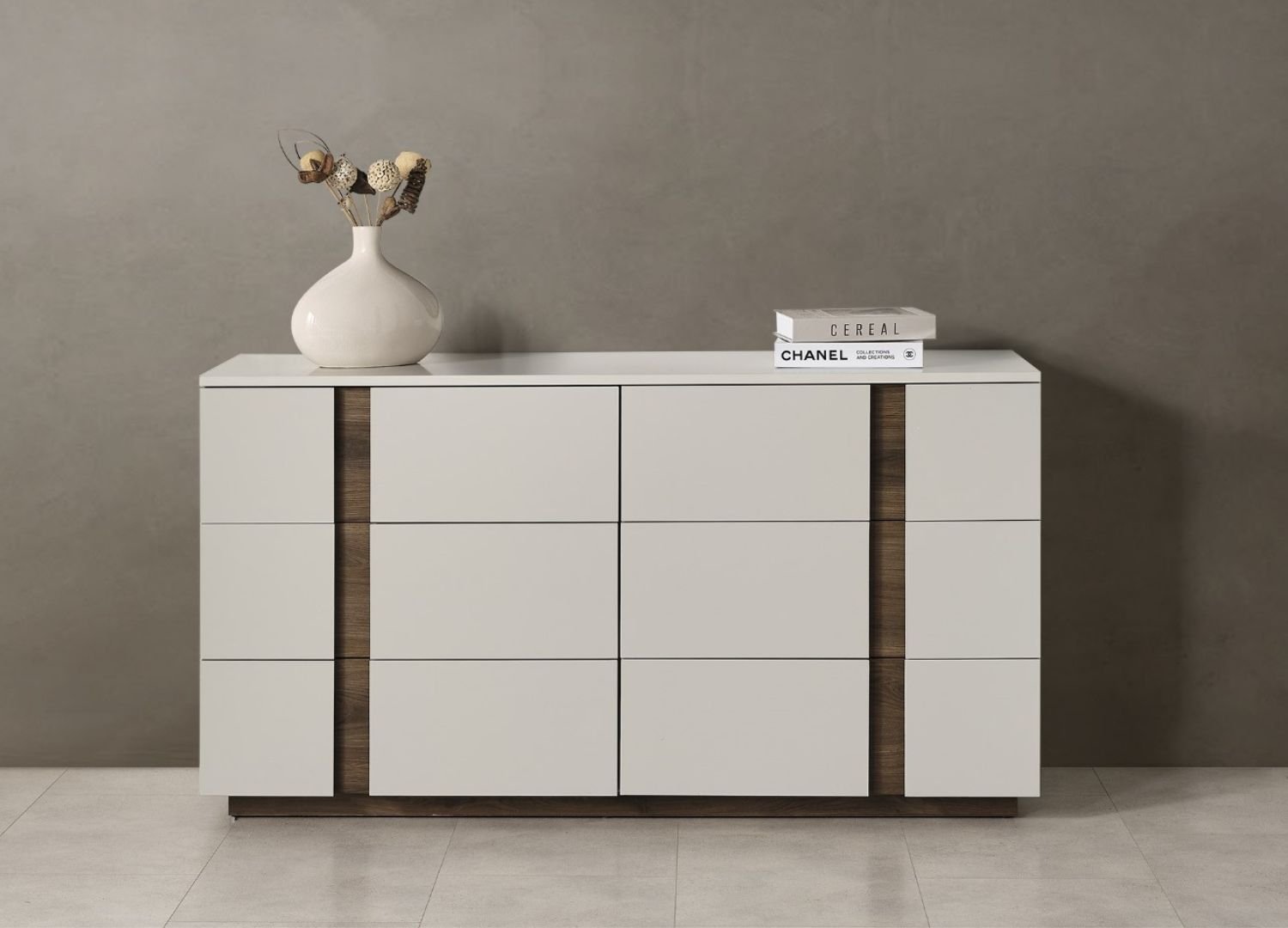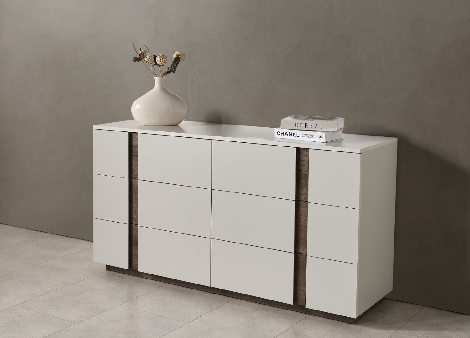 Undeniably contemporary, Romina Dresser is full of bold presence and yet harmonious enough to enhance the bedroom space. Being part of the Romina collection this dresser adds an effortlessly elegance with a distinct modern aesthetic elevating your sleep sanctuary.