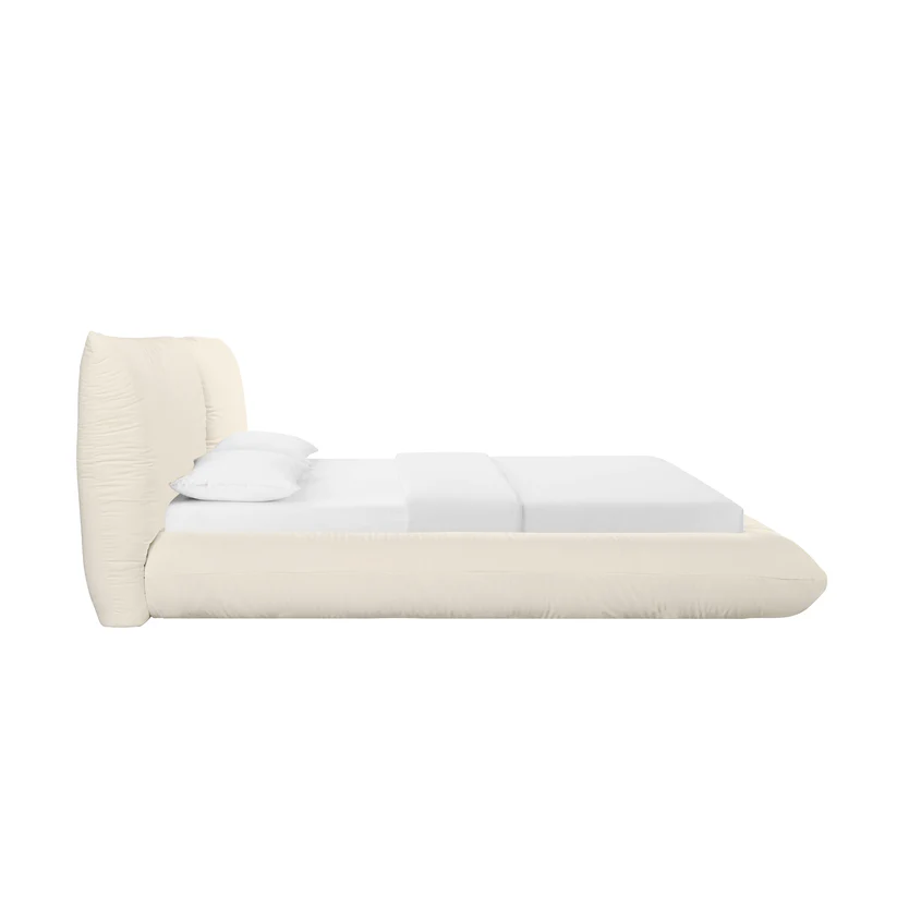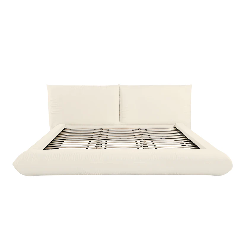 Meet the Romp Cream 100% Recycled Linen Bed—our most ingenious creation to date, bringing overtly plush and ultra-luxurious style to the mass market like never before. Utilizing a unique assembly technique, the pillowed nature of the bed frame is now available at an unprecedented price point. With two matching accent pillows included, this platform bed is not just a place to sleep but also the perfect spot to ‘romp around’ or enjoy your Netflix and chill.