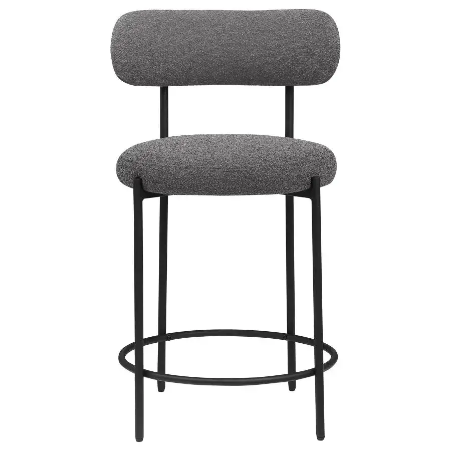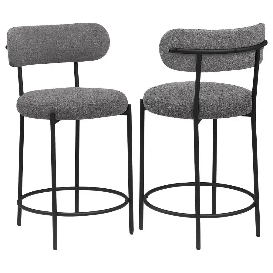 | Your kitchen island or counter table gets an instant upgrade with this set of two modern barstools. The pair features contemporary boucle upholstery in a neutral hue over foam cushions for comfort. Metal framing features a black finish and provides excellent support and durability with slim legs and supports that create a sleeks silhouette. Each counter stool showcases round seats and curved backrests for excellent comfort and support while enjoying a meal or catching up with the family. Finally, a ring footrest provides plenty of support and a charming touch of character. |